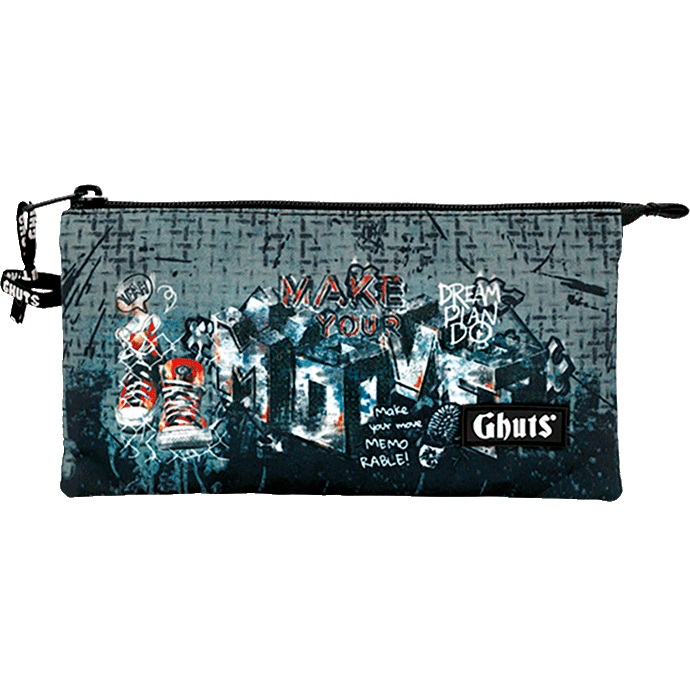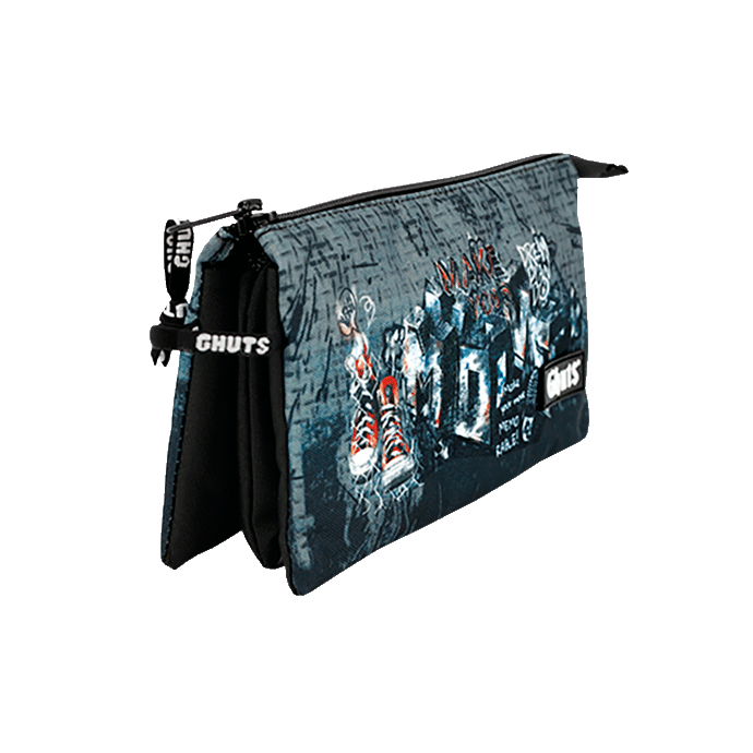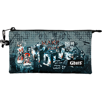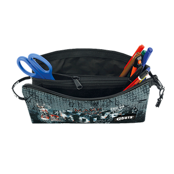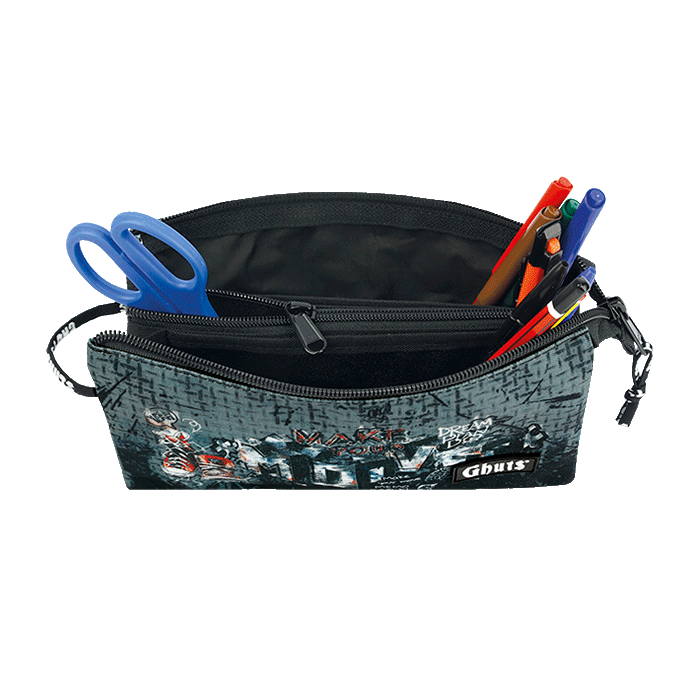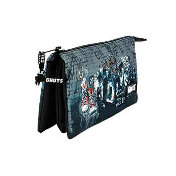 Estojo triplo. Com três compartimentos e bolsa com fecho interior.