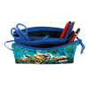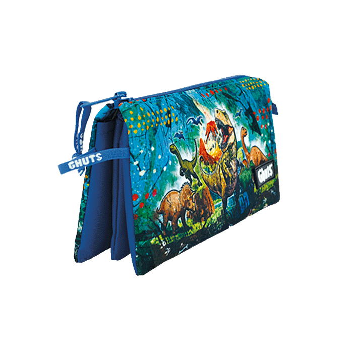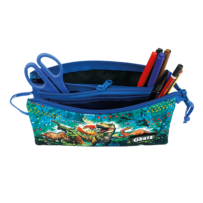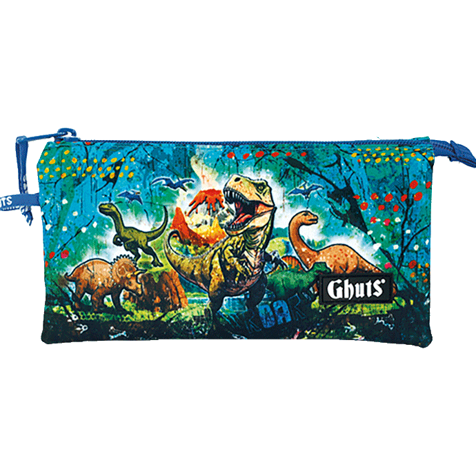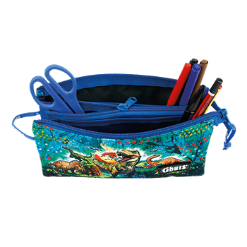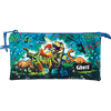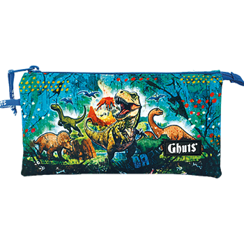 Estojo triplo. Com três compartimentos e bolsa com fecho interior.